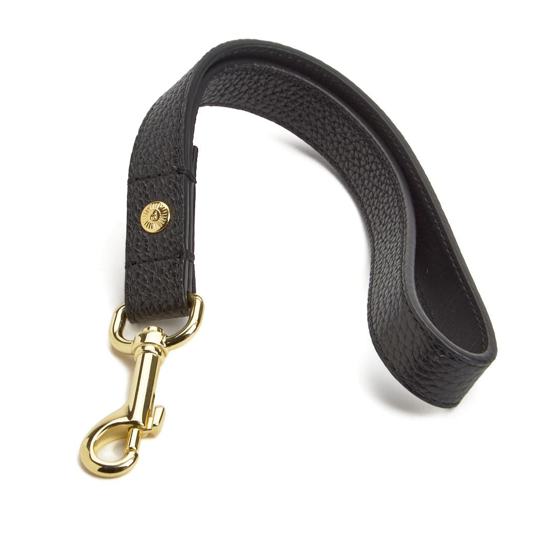 The Collins Seatbelt Tether in classic pebbled Black Leather with a Gold finish brings refined utility to every ride. Whether you're heading out for errands or winding down a city street, it works as a seatbelt tether, training tab, and short leash — keeping your dog close in style.